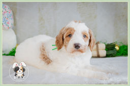 Periwinkle is a striking red-and-white Goldendoodle with vibrant markings that perfectly match her bold personality. A sassy little explorer at heart, she moves through the world with confidence, curiosity, and just a hint of mischief—always ready to discover something new.